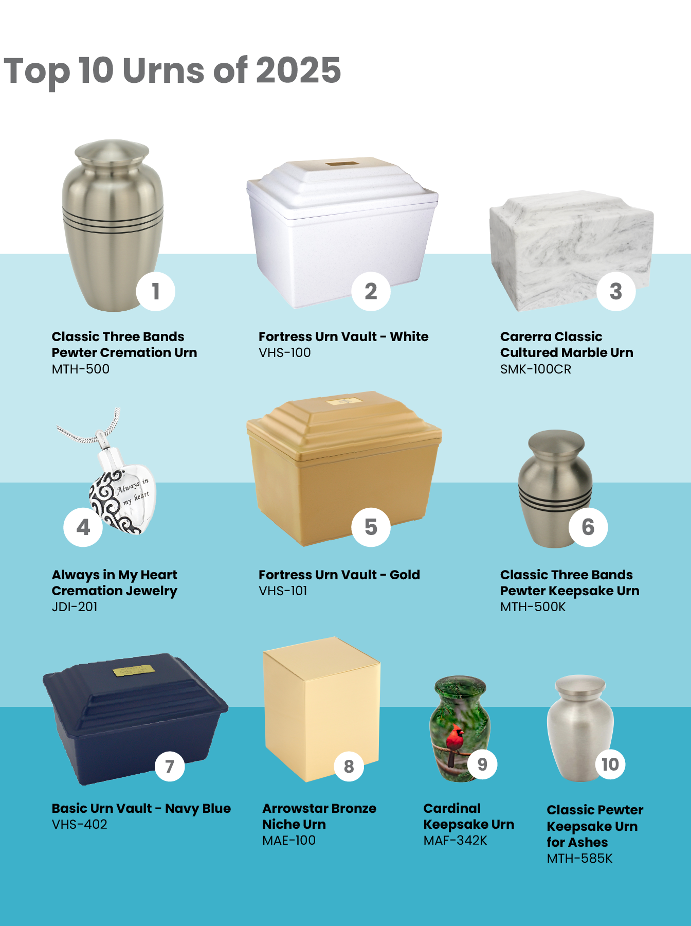 In many ways, 2025 delivered an encore. Once again, classic three-band designs carried the showroom, beloved symbols remained in the spotlight, and popular colors held their place on the top shelf. But behind the curtain (our year-end sales data), a different story unfolded. Find out what we discovered when we reviewed the top urn and jewelry sellers of 2025—and which memorials are worth watching this season.